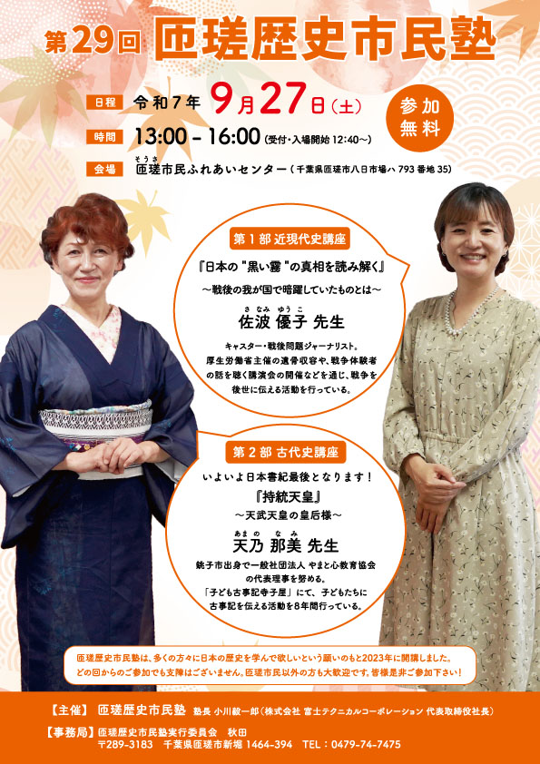匝瑳歴史市民塾は、「地元から日本の歴史を学び直す」ことを目的に、市民有志によって続けられてきた歴史講座です。古代から近現代まで幅広いテーマを扱い、専門家や研究者の講義を通じて、郷土と日本の歴史をわかりやすく学ぶことができます。