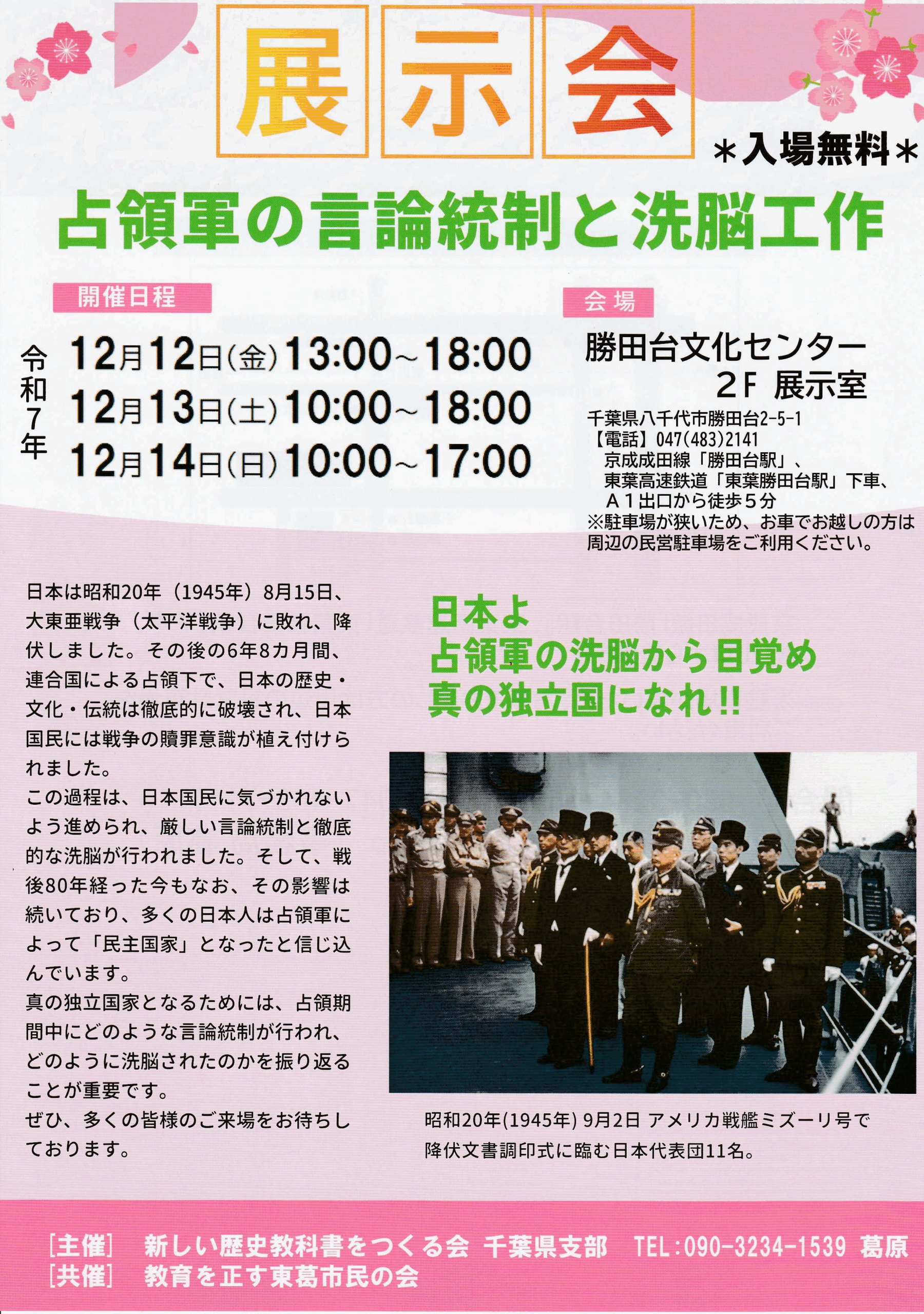 東葛市民の会日本の心を育む会会員・我孫子市在住の岩渕さんが所属されている「新しい歴史教科書をつくる会 千葉県支部」主催の展示会が、下記の通り開催されます。